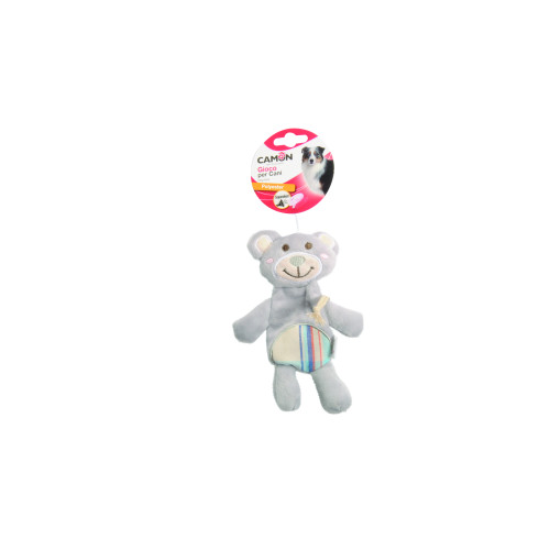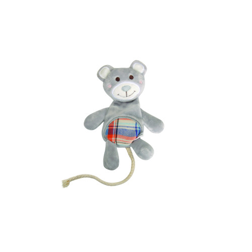 Jucarie pentru caini Camon Ursulet de plus cu coada din franghie 11,5x17h cm este o jucarie cu scartaitor intern amuzanta si colorata din panza pentru caini, in forma de ursulet.